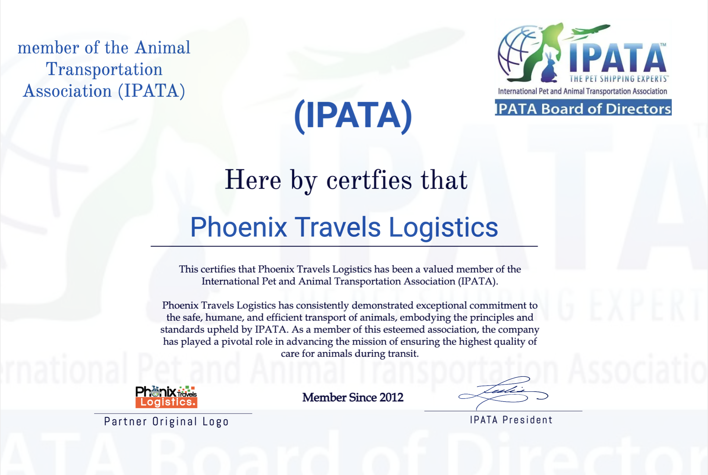 Phoenix Travels Logistics is a trusted name in the pet delivery industry, proudly serving clients since our establishment in 2012. With over a decade of experience, we have earned a reputation for providing safe, reliable, and compassionate transportation services tailored to the unique needs of pets and their owners. Our dedication to excellence stems from our love for animals and our commitment to ensuring their well-being during every stage of the journey. We specialize in the secure and stress-free transport of pets, whether for relocations, adoptions, or specialized travel requirements.